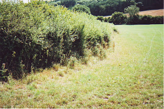 A short distance down is a gap in the hedge. The hedge then continues with a ditch running along its middle, which could have been the original boundary. This ditch can just be discernible in this photograph.